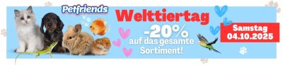 Petfriends.ch führt exklusive Produkte zur Pflege, Versorgung, Ernährung und Haltung in erstklassiger Qualität. So entdecken auch Zierfischfreunde in der Rubrik Aquaristik Gutes für Fische im Süss- und Salzwassermilieu. Zubehör für exotische Haustiere kaufen Sie günstig im Terraristik Shop. Auch Meerschweinchen, Hamster, Wellensittich und Papagei freuen sich über Schönes zum Wohnen, Knabbern und Spielen. Im Petfriends Tierfachhandel können Sie bequem alles für den Heimtierbedarf online bestellen und sich den kostenlosen Versand sichern (Ausnahme: Unikat-Kratzbäume)! Ihr versierter Online Zoo-Fachmarkt garantiert ausgezeichneten Kundenservice, zeitpunktgenaue Lieferung, kostenfreie Expertenberatung, hohe Verfügbarkeit am Lager und natürlich erfreulich niedrige Preise.