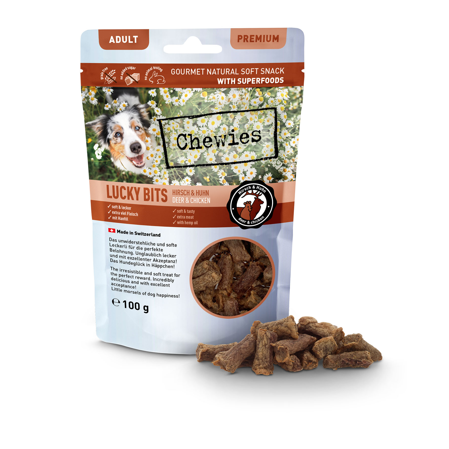 Chewies LUCKY BITS sind unsere Superfood-Leckerli mit extra viel Fleisch und exzellenter Akzeptanz. Jede Sorte beinhaltet besondere, auf die jeweilige Lebensphase abgestimmte Zutaten in speziell konzipierten Rezepturen. Die soften Stückchen mit dem hohen Fleischanteil eignen sich perfekt als kleine Zwischenmahlzeit oder zur Belohnung beim Training. Superfoods wie Bierhefe, Gingko oder Hanföl liefern den Vierbeinern besonders viele Nährstoffe. Unsere Chewies LUCKY BITS enthalten weder Getreide noch Zuckerzusatz und werden unter besten Bedingungen in der Schweiz hergestellt – selbstverständlich ohne Gentechnik oder Tierversuche. Neun leckere Sorten, darunter auch Monoptotein-Varianten sowie ein TASTY MIX (bestehend aus 3 Sorten in einem Mixpack) bieten Hunden eine tolle Abwechslung. Das unwiderstehliche und softe Leckerli für die perfekte Belohnung – vom Junior über Adult bis zum Senior. Chewies – 100 % Hund!
