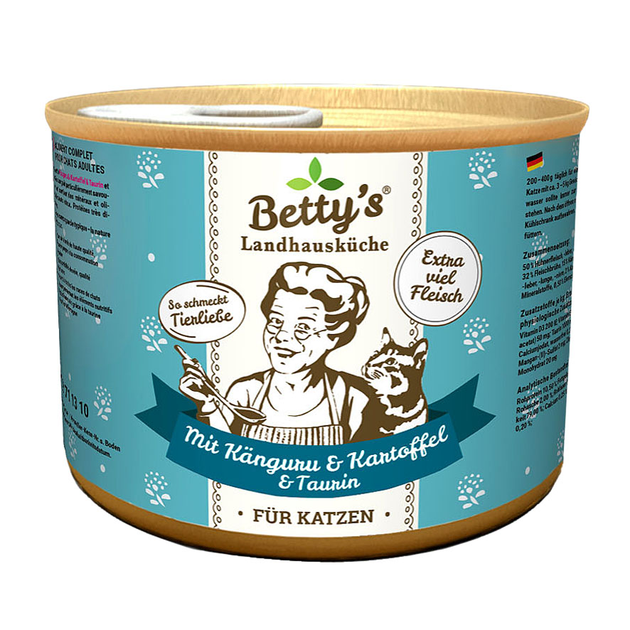 Kängurufleisch, -herz, -leber, -lunge, -niere (30%), Hühnerfleisch, leber, -herz (30%), Fleischbrühe (28.8%), Rinderlunge (10%), Eierschalen, getrocknet (0.5%), Mineralstoffe (0.5%), Borretschsamenöl (0.1%), Katzenminze (0.1%).