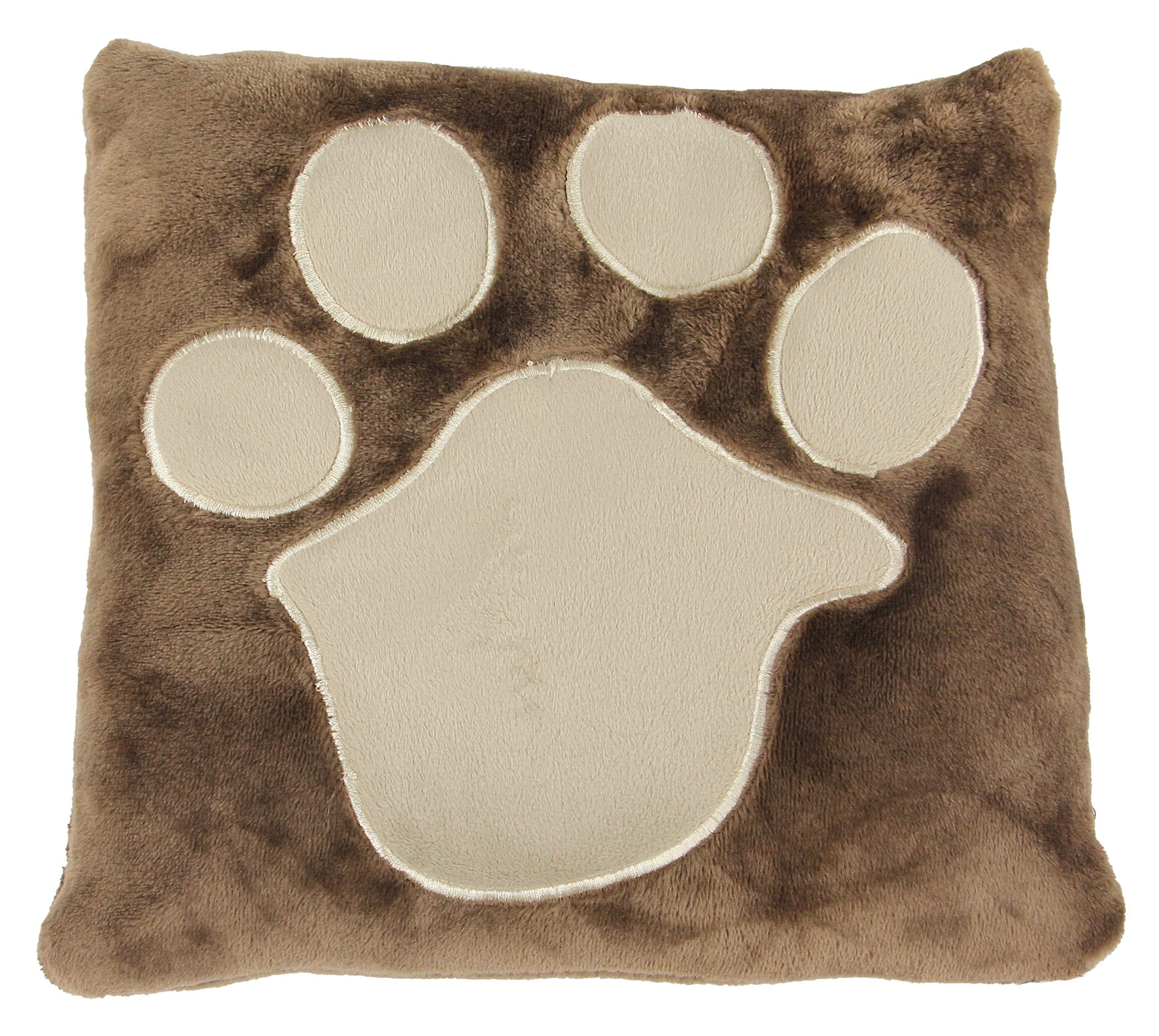 Hundedecke und dazu passende Kissenhülle aus Softplüsch. Die Kissenhülle hat ein grosses aufgesticktes Pfotenmotiv. Die Decke ist dunkelbraune, die dazu passende Kissenhülle ist dunkelbraun