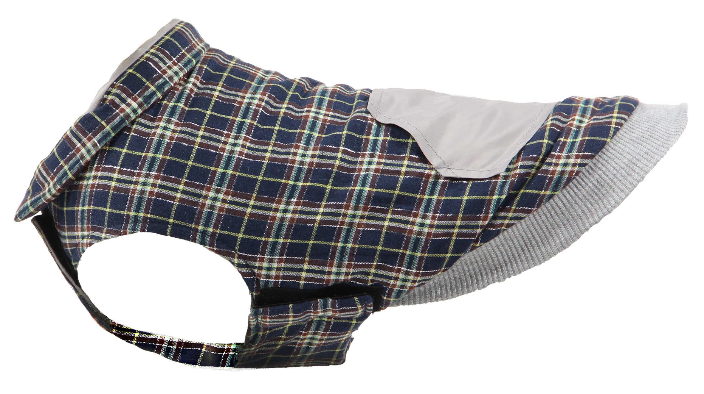 Hundemantel Oakland, beidseitig tragbar, 1 Seite Baumwolle, d’blau & Schottenmuster bunt, 1 Seite Nylon grau, mit Klettverschluss.