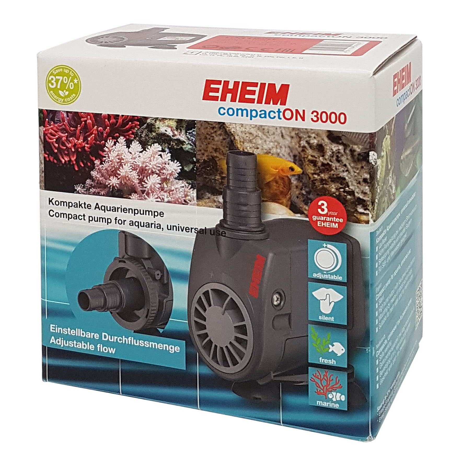 Les pompes d'aquarium compactes pour une utilisation sous-marin. Grille de protecteur - protège les habitants de l'aquarium et la pompe. Entièrement immergées. Silencieuse et faible consommation électrique.Fidèle à son nom, la pompe d'aquarium EHEIM compactON se caractérise par un design compact et peut être utilisée dans de nombreuses applications grâce au sachet d'accessoires fourni. Grâce à des matériaux de haute qualité, l'utilisation en eau de mer est également facilement possible.