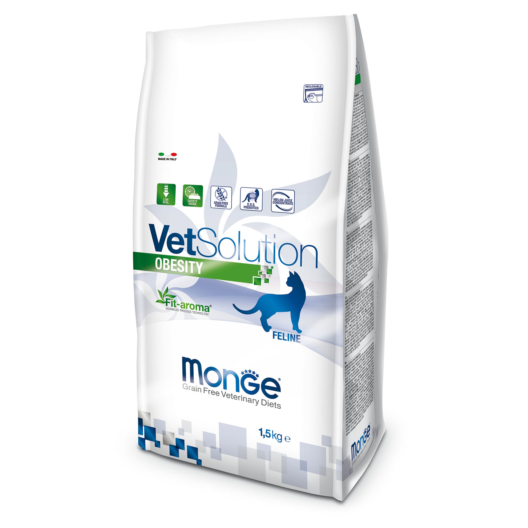 MONGE VETSOLUTION OBESITY FELINE est un aliment diététique complet pour chats, développé pour réduire le poids corporel excessif. Il contient du jus de melon concentré pour neutraliser les radicaux libres, des graines de plantago pour retarder la vidange gastrique et induire la satiété, des xylo-oligosaccharides (XOS) pour assurer le microbiote intestinal.