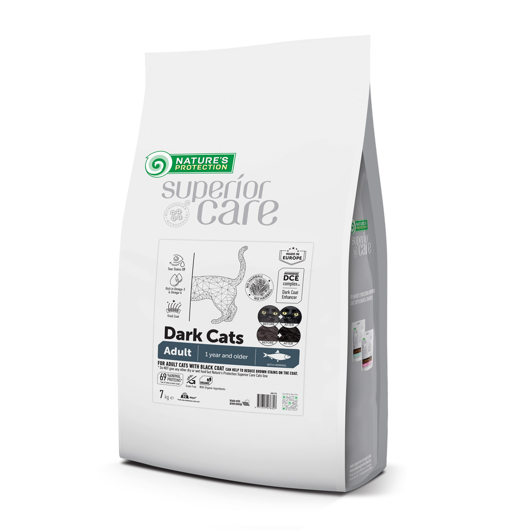 Nature's Protection Superior Care Dark Cats Grain Free with Herring for Adult All Breeds est un aliment sec pour chats Super Premium complet et équilibré avec une source de protéines de la plus haute qualité. Les ingrédients soigneusement sélectionnés et bien équilibrés de l'aliment rendent la structure des larmes et de la salive transparente et aident à protéger le pelage du chat des taches brunes. Cet aliment sec complet fabriqué selon une formule spéciale Dark Coat Enhancer (DCE) peut aider à protéger et à améliorer le pigment noir du pelage de votre chat. Une composition complète d'aliments secs pour chats fournit tous les nutriments efficaces et assure une bonne digestibilité et une bonne appétence.