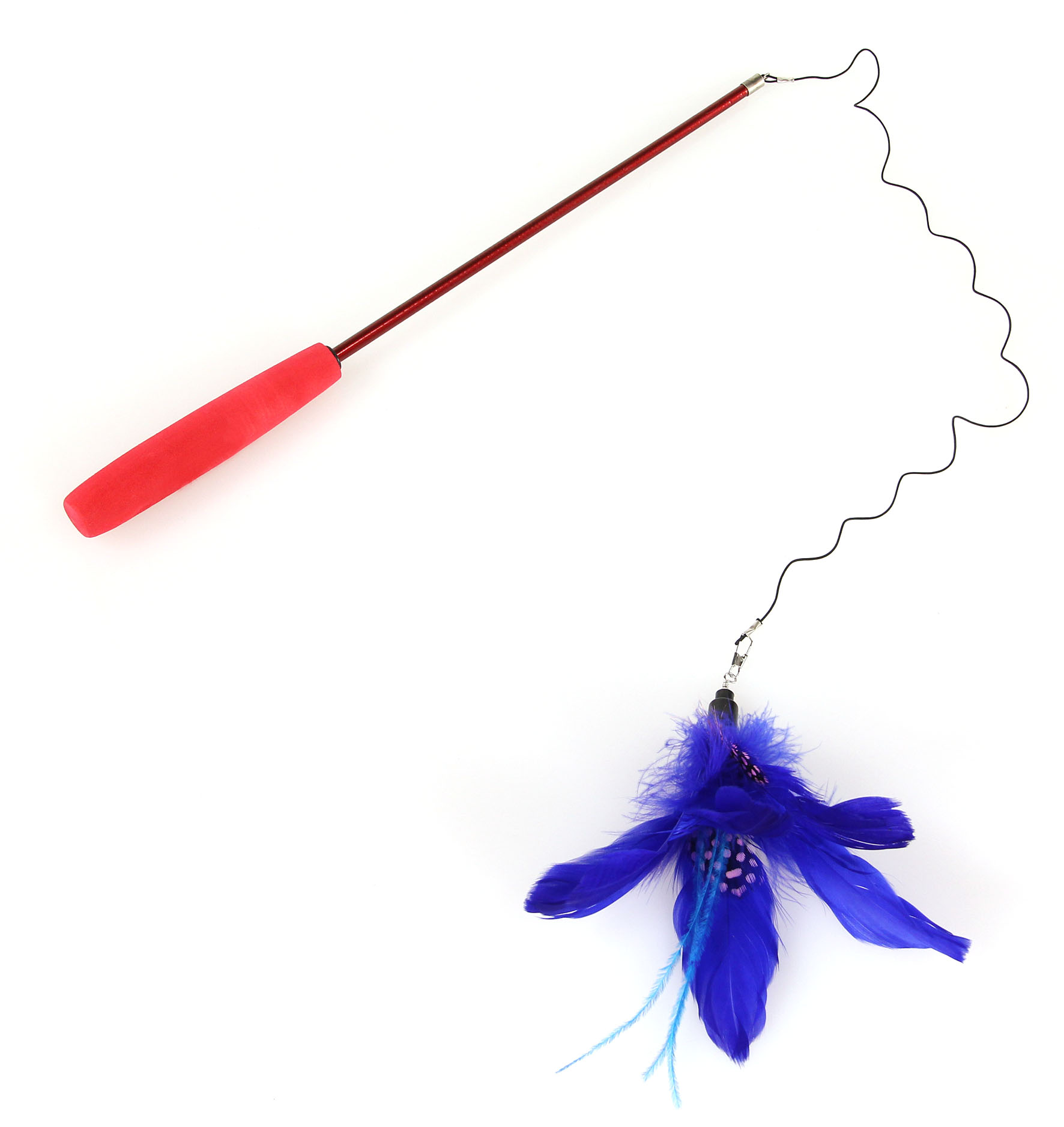 Canne à pêche de jeu pour chat avec poignée rouge souple, baguette téléscopique 25-83cm, des plumes bleues et noires sont ratachées à un cordon de nylon de 55cm.