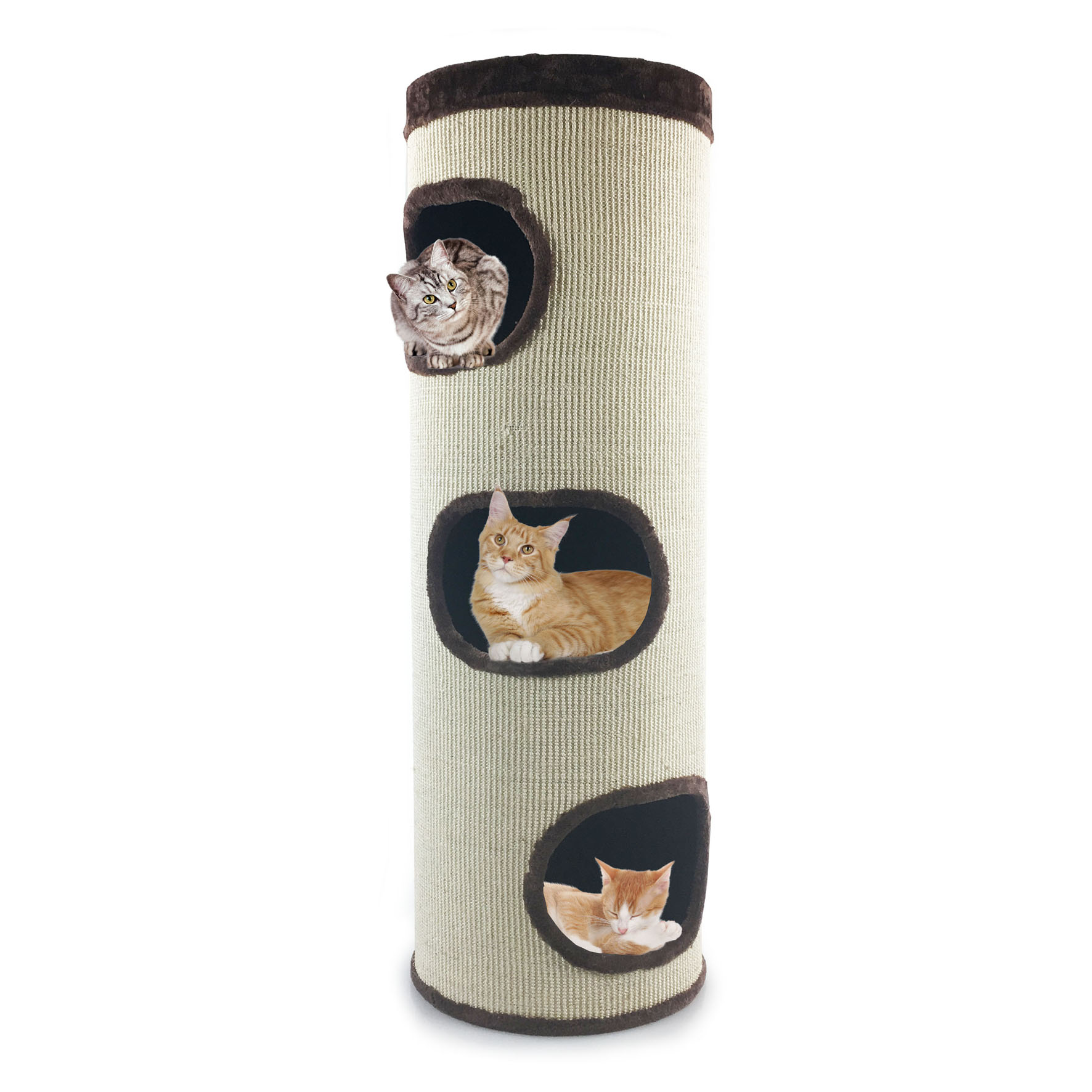 L‘arbre à chat exsiste en 3 tailles. Selon la taille, il offre à votre chat 2 à 4 niches pour dormir et une plate-forme de repos surélevée. L‘arbre à cgat entier est fabriqué à l‘extérieur en sisal résistant et il est parfaitement adapté pour l‘entretien des griffes et à l‘escalade. Toutes les surfaces pour s‘allonger sont en tissu pelucheux brun foncé. A l‘intérieur, les trous servent à monter d‘une niche à l‘autre.