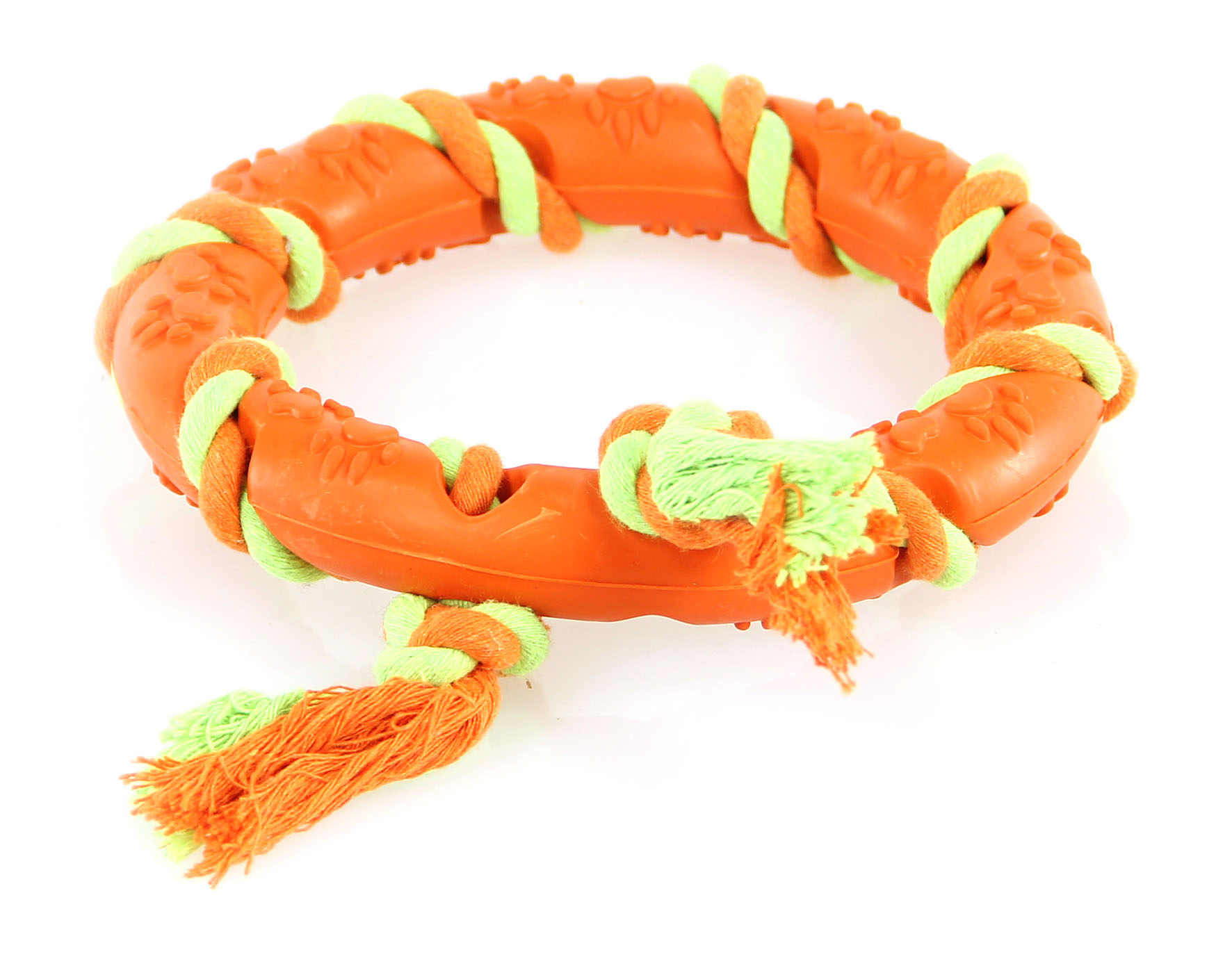 Anello in gomma dura avvolto da una corda di cotone annodata. La corda pulisce i denti e massaggia le gengive. L'igiene orale è molto importante per ogni animale e contribuisce al benessere generale. Colore: arancione/nero o arancione/giallo. Dimensione: Ø15 cm.