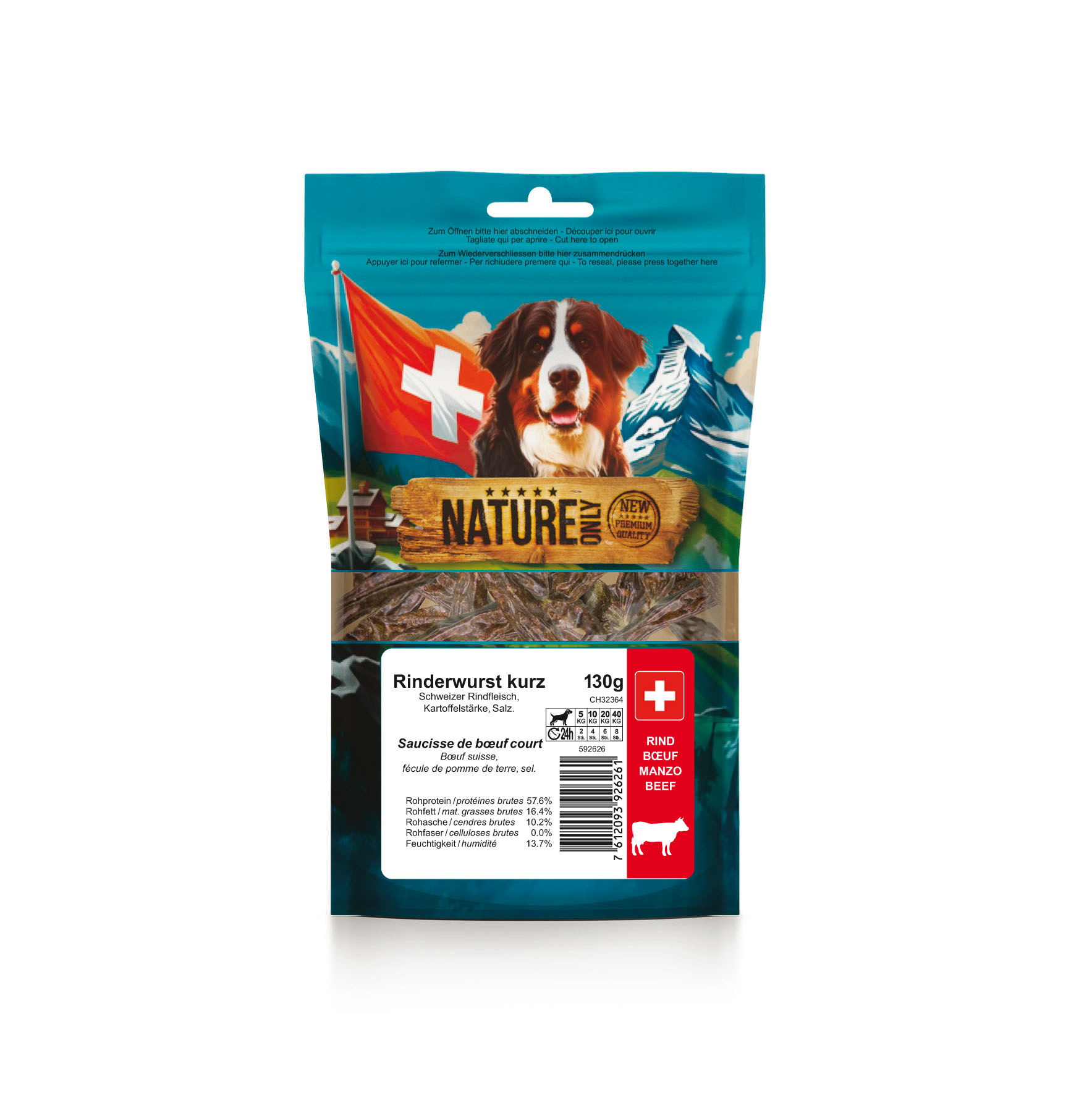 Alle Dog‘s Nature-Kausnacks sind handgefertigt und bestehen aus purem Schweizer Fleisch. Zertifizierte Qualität ist uns wichtig: Nature Only ist nach dem Lebensmittelstandard “IFS“ geprüft und zertifiziert. Rohstoffe werden bei bekannten Lieferanten gekauft mit welchen wir seit mehr als 10 Jahren zusammenarbeiten und dialogisieren. Der jährliche Zertifizierungsprozess garantiert darüber hinaus die gleichbleibend hohe Fleischqualität unserer Produkte. Premium Mono-Protein Snack-Linie. Ergänzungsfutter auf natürlicher Basis. Der ideale Snack für die tägliche Belohnung.
