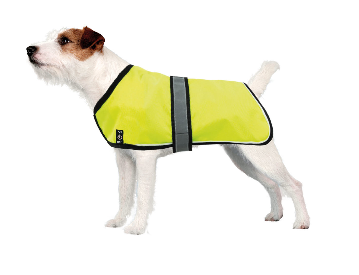 Die enorme Leuchtkraft des Hundeleuchtmantels wird durch die am Rand angebrachten LED-Lämpchen noch verstärkt.
