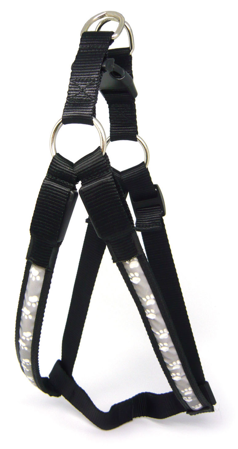 Hundegeschirr mit Blink- und Leuchtfunktion und mit Pfotenmotiv. Dank der Leuchtfunktion ist es sichtbar bis 300m. Lange Betriebsdauer von 130-200 Stunden. Lieferung inklusive Batterien. In drei Grössen erhältlich. Auch das dazu passende Halsband und Leine sind erhältlich.