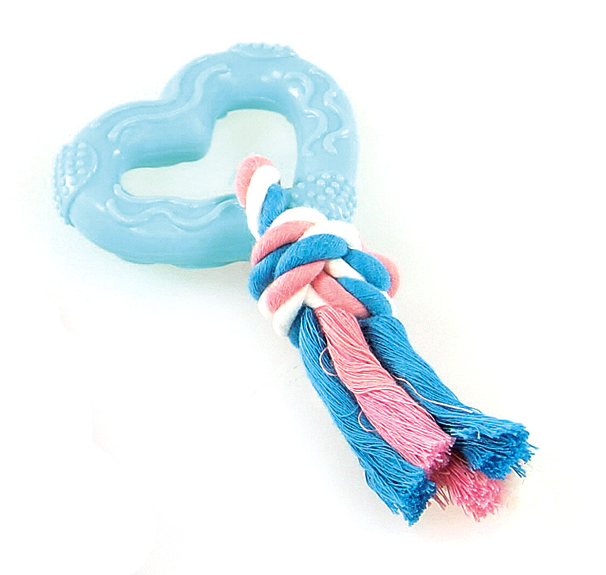 Dank der unebenen Oberfläche des Gummi-Herzens sowie der robusten Baumwollschnur werden beim Spielen zugleich auch die Zähne Ihres Welpen gereinigt und das Zahnfleisch massiert. Für junge Hunde ist es vor allem in der Zeit des Zahnwechsels besonders wichtig, dass sie einen Gegenstand haben, auf dem sie herumkauen dürfen. Denn im Zahnwechsel nagen Hunde vermehrt, um die schmerzenden Milchzähne loszuwerden. Steht Ihrem kleinen Liebling in dieser Zeit kein Spielzeug zur Verfügung wird er einfach den nächstbesten Gegenstand nehmen, um darauf herum zu kauen.