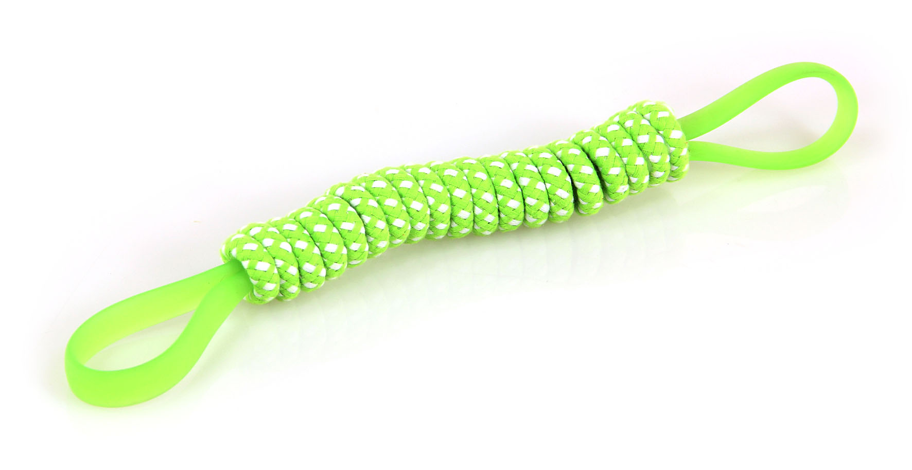 Geknotetes Spielzeug aus Nylon mit Gummiband. Eignet sich bestens als Wurfspielzeug. Durch das Seil können Sie das Spielzeug weit werfen, so dass Ihr Hund es mit Freude apportieren kann. Am Seil werden die Zähne gereinigt und das Zahnfleisch massiert. Zahnhygiene ist sehr wichtig und trägt zum allgemeinen Wohlbefinden bei.