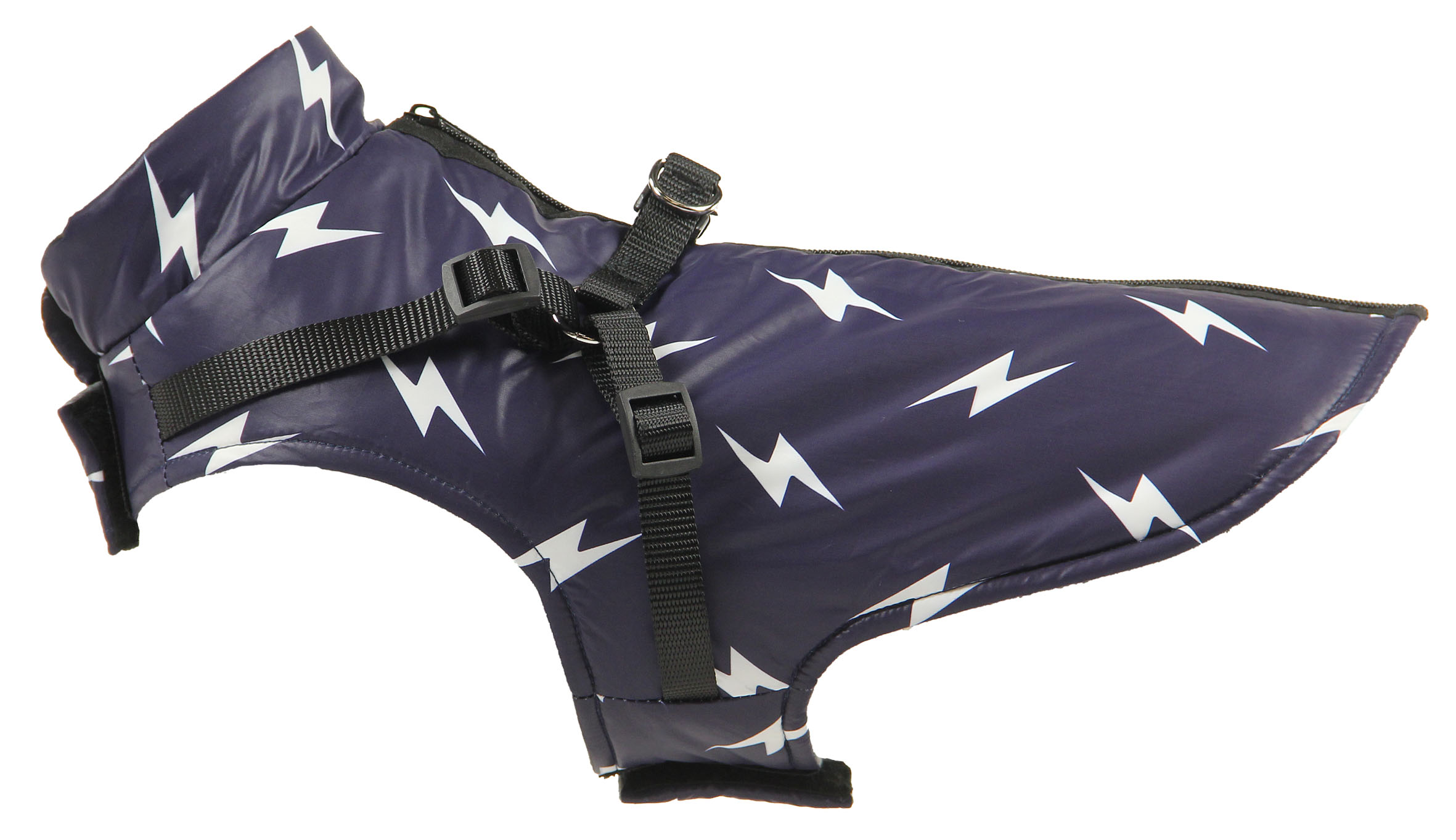 Hundemantel Blizzard, aussen Nylon dunkelblau mit weissen Blitzen, Reissverschluss als Deko, innen Trikot grau, mit Klettverschluss. Waschbar bei 30°C.