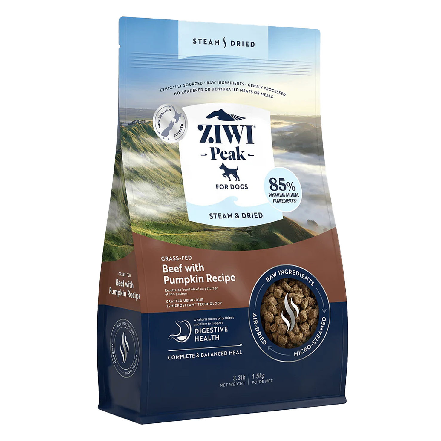 Hergestellt aus ethisch einwandfreiem rohem Rindfleisch von Neuseelands grünen Weiden mit Kürbis und Zichorienwurzel zur Unterstützung der Verdauungsgesundheit. Zart mikrogedämpft und dann schonend luftgetrocknet mit unserer innovativen zweistufigen Z-MicroSteam™-Technologie, um optimale Nährwerte und Schmackhaftigkeit zu gewährleisten.